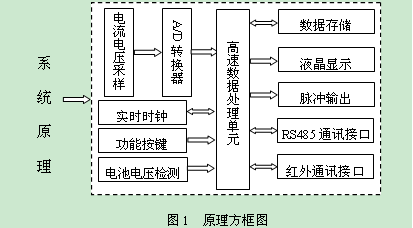 本產(chǎn)品由計(jì)量芯片、高速數(shù)據(jù)處理器、實(shí)時(shí)時(shí)鐘、數(shù)據(jù)接口設(shè)備組成。在高速數(shù)據(jù)處理器的控制下,通過計(jì)量芯片獲得有功電量、無功電量、功率、電壓、電流、功率因數(shù)、電網(wǎng)頻率等實(shí)時(shí)測量參數(shù),并依據(jù)相應(yīng)費(fèi)率和需量等要求對數(shù)據(jù)進(jìn)行處理,其結(jié)果保存在數(shù)據(jù)存儲器中,并隨時(shí)向外部接口提供信息和進(jìn)行數(shù)據(jù)交換,其原理框圖如圖1所示。