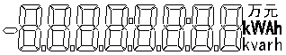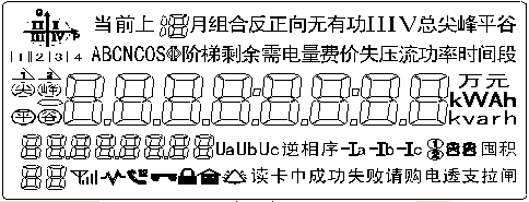 漢字字符,可指示: 1)當(dāng)前、上1月-上12月的正反向有功電量,組合有功或無功電量,Ⅰ、Ⅱ、Ⅲ、Ⅳ象限無功電量,最大需量,最大需量發(fā)生時(shí)間 2)時(shí)間、時(shí)段 3)分相電壓、電流、功率、功率因數(shù) 4)失壓、失流事件記錄 5)階梯電價(jià)、電量1234 6) 剩余電量(費(fèi)),尖、峰、平、谷電價(jià) |