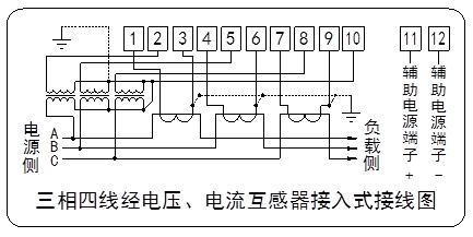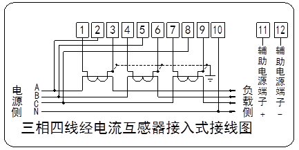 注2:當(dāng)電能表供電方式為“線路供電”時(shí),11、12輔助接線端子懸空;當(dāng)電能表供電方式為“線路和輔助電源(AD/DC自適應(yīng))供電”時(shí),11、12輔助接線端子接輔助電源。